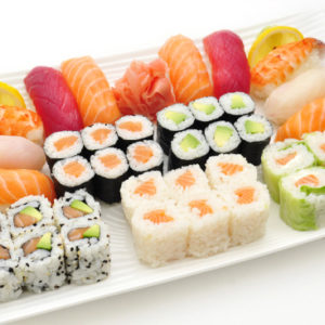 8 California thon cuit avocat – 2 sushi crevette – 8 maki saumon
